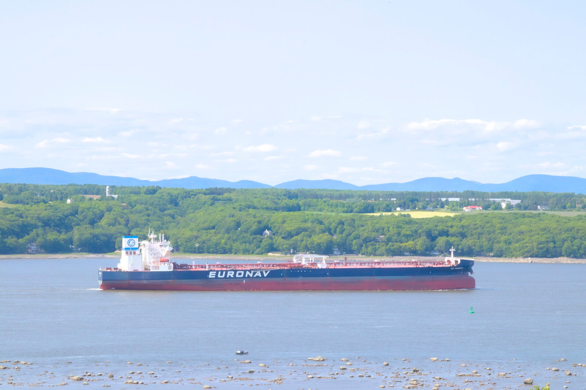 View of a cargo ship navigating the St. Lawrence River near Beaumont, Quebec, Canada